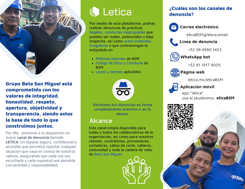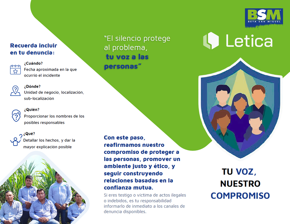 LETICATU VOZ, ES NUESTRO COMPROMISOGrupo Beta San Miguel está comprometido con los valores de integridad, honestidad, respeto, apertura, objetividad y transparencia, siendo estos la base de todo lo que construimos juntos. Por ello, ponemos a tu disposición un nuevo canal de denuncia llamado LETICA. Un espacio seguro, confidencial y accesible que permitirá reportar cualquier situación que vaya en contra de nuestros valores, asegurando que cada voz sea escuchada y cada inquietud sea atendida con seriedad y responsabilidad. Con este paso, reafirmamos nuestro compromiso de proteger a las personas, promover un ambiente justo y ético, y seguir construyendo relaciones basadas en la confianza mutua. Si eres testigo o víctima de actos ilegales o indebidos, es tu responsabilidad informarlo de inmediato a los canales de denuncia disponibles: